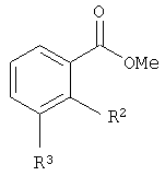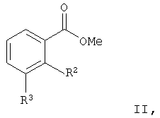 в которой R2 и R3 обозначают водород или группу XR11, Х обозначает C1-С6алкил, С2-С6алкенил или С2-С6алкинил, R11 обозначает необязательно замещенный C1-С6алкоксигруппой фенил или пиридил, при этом R2 и R3 не обозначают одновременно водород, а также их изомеры и соли. Указанные промежуточные соединения также являются объектом настоящего изобретения. Эти промежуточные продукты частично сами являются активными и могут благодаря их активности также применяться для получения соответствующего лекарственного средства, предназначенного для лечения опухолей, псориаза, артрита, такого как ревматоидный артрит, гемангиомы, ангиофибромы, глазных болезней, таких как диабетическая ретинопатия, неоваскулярная глаукома, заболеваний почек, таких как гломерулонефрит, диабетическая нефропатия, злокачественный нефросклероз, тромбомикроангиопатия, отторжение трансплантата и гломерулопатия, фиброзных заболеваний, таких как цирроз печени, заболеваний, связанных с пролиферацией мезангиальных клеток, артериосклероза и повреждений нервной ткани. Ниже получение предлагаемых соединений более подробно поясняется на примерах, которые не ограничивают объема изобретения. Пример 1.0 Получение амида (N-4-хлорфенил)-2-(4-пиридилэтил)бензойной кислоты К 105 мг метилового эфира 2-(4-перидилэтил)бензойной кислоты примешивают в 7,5 мг толуола 56 мг 4-хлоранилина, охлаждают до 4°С и в атмосфере аргона, исключая доступ влаги, смешивают с 0,22 мл триметилалюминия (2-молярный раствор в гексане). Затем смесь в течение 2 ч нагревают до температуры ванны 120°С. После охлаждения примешивают 30 мл разбавленного раствора бикарбоната натрия и дважды экстрагируют уксусным эфиром порциями по 25 мл. Органическую фазу промывают водой, сушат, фильтруют и концентрируют. Остаток хроматографируют на силикагеле с использованием в качестве элюента смеси этиловый эфир уксусной кислоты/циклогексан в соотношении 1:1. В результате получают 133 мг (89% от теории) амида (N-4-хлорфенил)-2-(4-пиридилэтил)бензойной кислоты в виде масла. Аналогично примеру 1.0 получают следующие соединения: