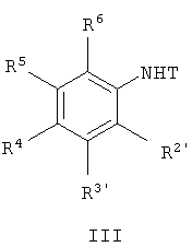 в которой R4-R6 имеют указанные выше значения, а Т обозначает защитную группу, ацилируют и затем при необходимости кетогруппу восстанавливают до спирта или алкана, защитную группу отщепляют, амин переводят в нитрил, нитрил омыляют и переводят в соответствующий амид. Описанные операции во всех случаях можно проводить в обратной последовательности. Процесс образования амидов осуществляют по методам, известным из литературы. Так, в частности, для образования амидов можно исходить из соответствующего сложного эфира. Этот эфир подвергают согласно Journ. Org. Chem., с.8414 (1995), взаимодействию с триметилалюминием и соответствующим амином в растворителях, таких как толуол, при температурах в интервале от 0°С до температуры кипения используемого растворителя. Если молекула, содержит две сложноэфирные группы, то их обе переводят в один и тот же амид. При использовании вместо сложного эфира нитрилов получают в аналогичных условиях амидины. Для получения амидов могут использоваться также все методы, известные из химии пептидов. Так, например, соответствующую кислоту можно подвергать в апротонных полярных растворителях, таких, в частности, как диметилформамид, с использованием соответствующего активированного производного кислоты, получаемого, например, с помощью гидроксибензотриазола и карбодиимида, такого как диизопропилкарбодиимид, или же с помощью предварительно образованных реагентов, таких, например, как ГАТУ (Chem. Comm., с.201 (1994)) или БТУ, при температурах в интервале от 0°С до температуры кипения растворителя, предпочтительно при 80°С, взаимодействию с амином. Для образования амидов можно применять также метод, где используют смешанный ангидрид кислоты, имидазолид или азид. Салициламиды можно получать взаимодействием соответствующего фенола в присутствии катализатора Фриделя-Крафтса, такого как трихлорид бора, с изоцианатами или изотиоцианатами в растворителях, таких, например, как толуол, при температурах в интервале от 0°С до температуры кипения используемого растворителя. Если предусматривается введение в молекулу различных амидных групп, то необходимо, например, вторую сложноэфирную группу вводить в молекулу после образования первой амидной группы и затем амидировать или в случае молекулы, в которой одна группа представлена в виде сложного эфира, а другая в виде кислоты, обе группы амидируют последовательно с помощью различных методов. Тиоамиды можно получать из антраниламидов взаимодействием с дифосфадитианами согласно Bull. Soc. Chim. Belg. 87, с.229 (1978), или взаимодействием с пентасульфидом фосфора в растворителях, таких как пиридин, либо вообще без использования растворителей при температурах в интервале от 0 до 200°С. Продукты могут подвергаться также электрофильному ароматическому замещению. Замещение в этих случаях проводят в соединениях формулы III в орто- либо пора-положении относительно аминогруппы или одной из аминогрупп (в соединениях формулы II – в мета-положении относительно карбонильной группы). Так, в частности, можно осуществлять ацилирование по Фриделю-Крафтсу с помощью хлорангидридов кислот в присутствии катализаторов Фриделя-Крафтса, таких, например, как трихлорид алюминия, в растворителях, таких как нитрометан, сероуглерод, метиленхлорид или нитробензол, при температурах в интервале от 0°С до температуры кипе