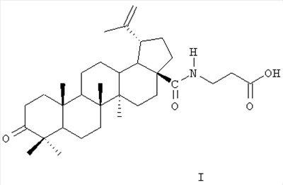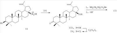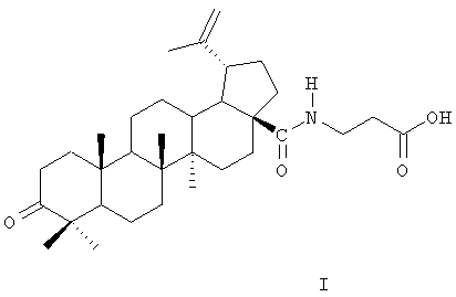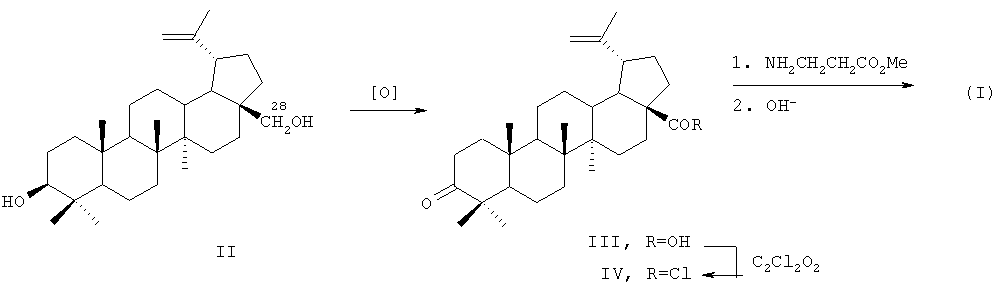 Соединение (I) синтезировано из доступного, извлекаемого из коры березы, тритерпеноида бетулина (II) по схеме 1. Условия синтеза и физико-химические характеристики агента (I) приведены в работе [4]. По нижеприведенной схеме бетулин II, полученный горячей экстракцией коры березы трихлорэтиленом, окисляют реактивом Джонса в ацетоне в бетулоновую кислоту III (температура 0-5°С, 7 ч, выход 85%, чистота 82% по ВЭЖХ). Полученный продукт обрабатывают хлористым оксалилом в хлористом метилене (20°С, 6 ч), получают хлорангидрид (IV). Выделение продукта IV производится трех-четырехкратной отгонкой метилена при контроле температуры, формирования осадка в диэтиловом эфире и его отфильтровывания. Конденсацией хлорангидрида IV с метиловым эфиром -аланина (безводный хлористый метилен, аргон, 20°С, 20 ч, выход 96%) получают соответствующий амид, содержащий у атома С(28) фрагмент метилового эфира -аланина. Щелочной гидролиз последнего действием 4 н. раствора гидроокиси натрия в смеси метанола и тетрагидрофурана (2:1, 20°С, 24 ч) приводит к -аланиламиду бетулоновой кислоты (N-[3-оксо-20(29)лупен-28-оил]-3-аминопропионовой кислоте) (I) (выделяют путем выливания реакционной массы на смесь льда и разбавленной HCl, отфильтровывают образовавшийся осадок, промывают водой, этанолом и высушивают в вакууме при 60°С, выход 97%. Аналитические характеристики образца: т.пл. 214-216°С (из ацетонитрила), (с 3.04, хлф); брутто-формула С33Н51NO4; Масс-спектр: Найдено [М]+ 525.38371. Вычислено М 525.38178.