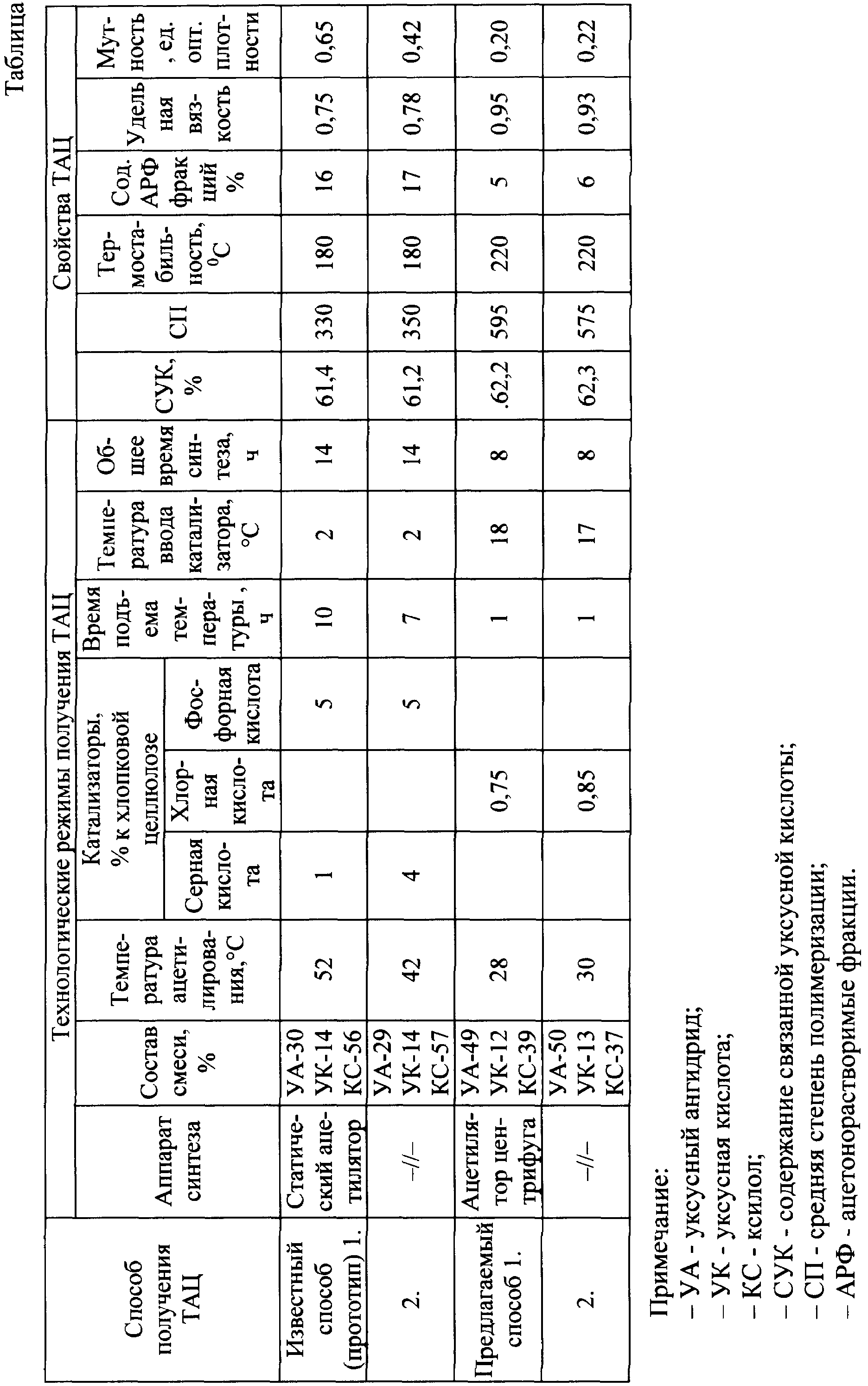 Способ получения триацетата целлюлозы ацетилированием хлопковой целлюлозы смесью уксусного ангидрида и уксусной кислоты в среде ксилола в присутствии кислотного катализатора, отличающийся тем, что ацетилирование ведут во вращающейся центрифуге при циркуляции смеси состава: уксусный ангидрид – 49-51%, уксусная кислота – 12-14%, ксилол – 36-39%, в качестве катализатора процесса ацетилирования используют хлорную кислоту в количестве 0,75-0,85% от массы целлюлозы, который вводят при температуре процесса 17-19°С, после чего в течение 1-1,5 ч поднимают температуру до 28-30°С и затем поддерживают такую температуру в течение 6-7 ч до начала нейтрализации катализатора.