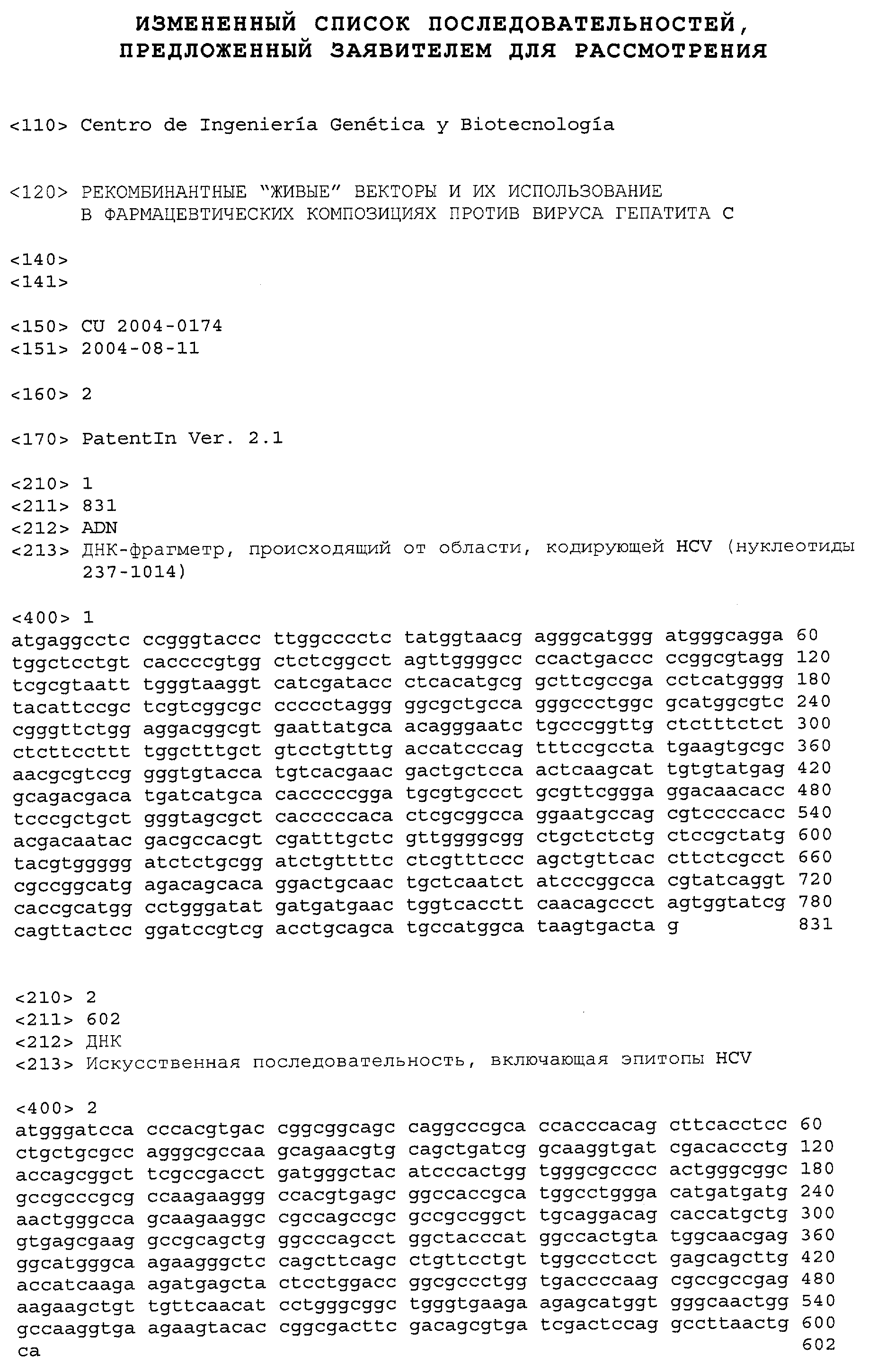 (54) РЕКОМБИНАНТНЫЕ ВЕКТОРЫ НА ОСНОВЕ “ЖИВОГО” ВИРУСА ОСПЫ ДОМАШНЕЙ ПТИЦЫ И ИХ ПРИМЕНЕНИЕ В ФАРМАЦЕВТИЧЕСКИХ КОМПОЗИЦИЯХ ПРОТИВ ВИРУСА ГЕПАТИТА С