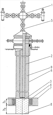 Наличие метанольной воды 3 на забое 8 скважины и столба газа 9 в стволе при закрытых задвижках 5 на фонтанной арматуре 1, образующего газовую шапку, препятствует поступлению газа из продуктивного пласта 7, с одной стороны, а с другой, – обеспечивает сохранность продуктивных характеристик скважины, так как метанольная вода не проникает в продуктивный пласт 7 и не загрязняет его, а если и попадет, то за счет наличия в ней метанола (метанолового спирта) загрязнения продуктивного пласта не произойдет.