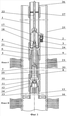 Установка состоит из цилиндра 1, снабженного боковым клапаном 2 с фильтром 3, на котором с помощью переходника 4 закреплены вспомогательный цилиндр 5 и через муфту 6 кожух 7 с образованием кольцевого пространства 8 между вспомогательным цилиндром 5 и кожухом 7. Вспомогательный цилиндр 5 имеет боковые отверстия 9. Нижний конец вспомогательного цилиндра 5 заглушен заглушкой 10. На кожухе 7 с помощью переходника 11 закреплены всасывающий клапан 12, фильтр 13 и через муфту 14 хвостовик 15. На конце хвостовика 15 закреплен пакер 16, который отделяет верхний пласт I от нижнего пласта II. Внутри цилиндра 1 размещен верхний плунжер 17, снабженный нагнетательным клапаном 18, а внутри вспомогательного цилиндра 5 размещен нижний плунжер 19, имеющий канал 20. Плунжера 17 и 19 жестко закреплены между собой штоком 21, образуя в комплексе комбинированный плунжер, который приводится в движение при помощи насосных штанг 22, соединенных со станком-качалкой (не показан). Шток 21 имеет с обеих сторон отверстия для прохода пластовой жидкости 23 и 24 соответственно. Установка спущена в эксплуатационную колонну скважины 25 на колонне насосно-компрессорных труб 26 и соединена с последней муфтой 27.