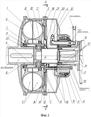 – коллектор 11, в который вмонтированы: управляемая поворотная черпательная трубка 12 и коммуникация отвода рабочей жидкости; неповоротная (стационарная) черпательная трубка 13 и коммуникация отвода рабочей жидкости; торцовое уплотнение 14; поворотная трубка 15 и коммуникация для откачки рабочей жидкости из нижней точки дополнительного объема Г; коммуникация и форсунка 16 подачи рабочей жидкости в рабочий объем Е; коммуникации и форсунки 17 для смазки и охлаждения подшипников и контактных колец торцового уплотнения 14; коммуникации суфлирования – С, то есть сообщения свободного от жидкости рабочего объема Е и дополнительного объема Г с атмосферой через маслоуловители.