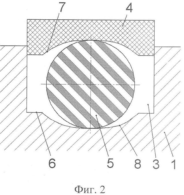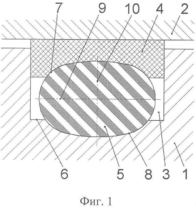 Уплотнительное соединение работает следующим образом. При монтаже соединения кольцевой элемент 4 радиально деформируется, передавая нагрузку эластомерному кольцу 5, которое, упруго деформируясь, заполняет объем кольцевых канавок 7, 8 в деталях 1 и 4, обеспечивая требуемые начальные напряжения на границах контакта с деталями 1, 4, и на подвижной границе контакта кольцевого элемента 4 с контрдеталью 2.