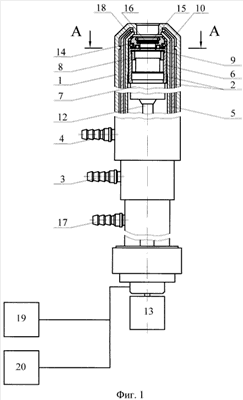 Сущность изобретения поясняется чертежами, где на фиг.1 представлен общий вид устройства, продольный разрез; на фиг.2 – сечение А-А фиг.1.