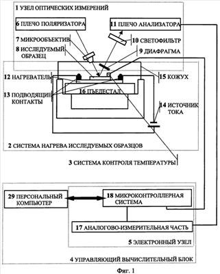 Управляющий вычислительный блок реализован на базе персонального компьютера, с которым связан электронный узел, состоящий из аналогово-измерительной части в составе аналого-цифровых преобразователей. Электронный узел связан с узлом оптических измерений и системой контроля образца с возможностью оцифровывания аналоговых сигналов с фотоприемников эллипсометра и термопары.