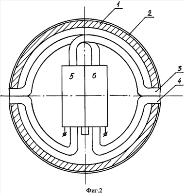 На фиг.2 представлен трансформаторный датчик переменного электрического поля, содержащий герметичный магнитостатический экран 1, покрытый диэлектрической оболочкой 2, первую диэлектрическую трубу 3 и вторую диэлектрическую трубу 4, концы которых открыты в окружающую среду, первую тороидальную катушку 5 и вторую тороидальную катушку 6, идентичную первой.