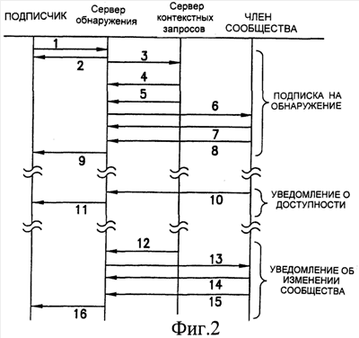 В случае изменения сервер 28 контекстных запросов формирует сообщение NOTIFY протокола SIP (сообщение 12 на фиг.2), которое содержит обновленное множество членов 26 сообщества. Если новый набор членов сообщества показывает удаление бывшего члена, то сервер 20 обнаружения, а именно логика 20F, удаляет члена сообщества из внутреннего списка 21, чтобы избежать отправок уведомлений о доступности подписчику 12 от не-членов сообщества. Если новый набор членов сообщества показывает добавление члена сообщества, то сервер 20 обнаружения инициирует подписку на возможность использования сервиса/контента, сходную с последовательностью сообщений 6-9. Таким образом, сервер 20 обнаружения отправляет сообщение SUBSCRIBE протокола SIP каждому новому члену 26 сообщества (показано как сообщение 13 на фиг.2). Тело сообщения содержит относящуюся к сервису/контенту часть исходного сообщения подписки на обнаружение, отправленного подписчиком 12 (сообщение 1 на фиг.2). Если член 26 сообщества поддерживает подписку и предоставляет ее на основании политики авторизации, то член 26 сообщества отвечает сообщением ‘200 OK’ (по RFC3265), которое отправляется как сообщение 14 на фиг.2. Далее член 26 сообщества отвечает сообщением NOTIFY протокола SIP, отправляемым как сообщение 15 на фиг.2 и содержащим начальный набор сервисов, который удовлетворяет предоставленным ограничениям подписки на сервис. По получении всех ответов от всех новых членов 26 сообщества (либо по получении начальных сообщений NOTIFY протокола SIP, либо по получении кодов ошибок в тех случаях, когда подписка не может быть предоставлена) сервер 20 обнаружения порождает сообщение NOTIFY протокола SIP, содержащее накопленное множество сервисов, которые были обнаружены, и отправляет его подписчику 12 (сообщение 16 на фиг.2).