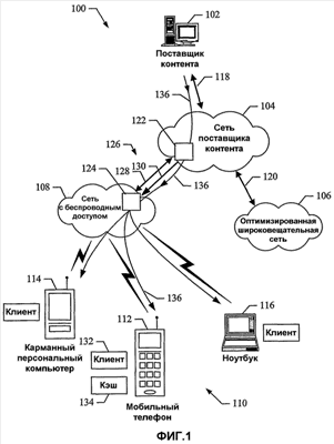 Сеть 100 содержит поставщика 102 контента, сеть 104 поставщика контента, оптимизированную широковещательную сеть 106 и сеть 108 с беспроводным доступом. Сеть 100 также включает в себя устройства 110, которые выполнены в виде мобильного телефона 112, карманного персонального компьютера (PDA) 114 и ноутбука 116. Устройства 110 иллюстрируют только некоторые из устройств, которые подходят для использования в одном или нескольких вариантах осуществления системы доставки. Следует отметить, что хотя показаны три устройства на фиг.1, фактически любое количество устройств или типов устройств подходит для использования в системе доставки.