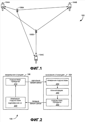 Подсистема 210 передачи доставляет оценку C/I по обратной линии связи на обслуживающую базовую станцию. В ситуации гибкой передачи обслуживания, известной в области техники, сигналы обратной линии связи, передаваемые от мобильной станции, могут быть приняты одной или несколькими базовыми станциями, отличными от обслуживающей базовой станции, определяемыми как не-обслуживающие базовые станции. В базовой станции 104 приемная подсистема 230 принимает от мобильной станции 106 информацию C/I.