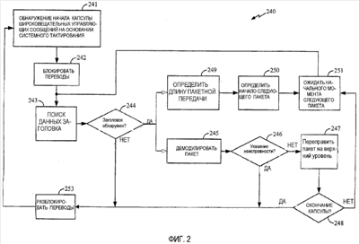 После обнаружения заголовка на этапе 244 последовательность операций способа также определяет длину пакета, следующего за обнаруженным заголовком, на этапе 249. Длина пакета и скорость передачи данных, следующих за заголовком данных, могут быть определены на основании структуры обнаруженного заголовка. На основании информации о длине пакета на этапе 250 последовательность операций способа определяет начало следующего пакета данных в капсуле широковещательных управляющих сообщений. На этапе 251 после надлежащего периода ожидания, соответствующего ожидаемому начальному моменту следующего заголовка, последовательность операций способа зацикливается обратно на этап 243, чтобы ожидать другой заголовок в капсуле управляющих сообщений, чтобы определить, был ли обнаружен заголовок на этапе 244. К тому же, последовательность 240 операций способа на этапе 247 после переправки декодированных данных пакета на верхний уровень переходит к этапу 248. На этапе 248 последовательность операций способа определяет, было ли достигнуто окончание капсулы широковещательных управляющих сообщений. Окончание сообщений может быть определено посредством декодирования сообщений в пакете. Если обнаружено окончание сообщений, последовательность операций способа переходит к этапу 253, чтобы разблокировать последовательность операций перевода. Если окончание сообщений не достигнуто, последовательность 240 операций способа переходит к этапу 251 и зацикливается обратно на этап 244, чтобы ожидать другой заголовок.