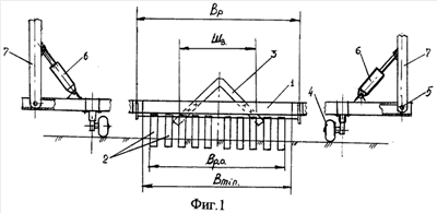 где Tmin. – минимальная мощность трактора, кгс; n – число рабочих органов в ряду, начиная с 1, Ки. – коэффициент использования мощности 0,8-0,9; k – число рядов, Ус. – удельное сопротивление одного рабочего органа, кгс/м, при этом рабочая длина бруса-рамы – Вр. должна удовлетворять соотношению Шз.<Вр.>Bmin., где Шз. – ширина крепежной части замка автоматической сцепки, которая является частью навески и выполнена с возможностью продольных и поперечных перемещений по брусу-раме, а ширина захвата рабочих органов – Вр.о.<Вр. и внутри Вр.о. они расставлены с равным шагом вдоль ряда, а между рядами – с равным шагом между собой, при использовании более мощного трактора длину бруса-рамы наращивают вместе с рабочими органами или на половину Bmin. с обоих концов или на Bmin. – с одного, но тогда замок автоматической сцепки перемещают на стык наращенного бруса-рамы и устанавливают симметрично относительного него и так до Bmin=8 м как предельной длины для проселочных дорог, после чего близко к концам бруса-рамы устанавливают самоустанавливающиеся колеса известной конструкции и концы бруса-рамы снабжают односторонними шарнирами и гидроцилиндрами, дающими возможность складывать боковые крылья культиватора вверх или горизонтально вперед, но тогда на крыльях ближе к их концам дополнительно устанавливают самоустанавливающиеся колеса, причем увеличивают ширину захвата парового культиватора после шарниров путем прикрепления новых участков бруса-рамы такого же сечения и длиной, равной половине или целой Bmin, симметрично с обоих концов до исчерпания мощности трактора, но общей длиной не более 22-25 м.