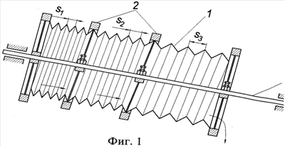 В зависимости от вида и физико-механических свойств семян, выбранного режима работы на участках между двумя дисками 2 устанавливают шаг канавок S спирально-гофрированного барабана 1 перемещением вырезных дисков 2 по приводному валу 3. В процессе работы семена перемещают по винтовой канавке к выходу из барабана 1.
