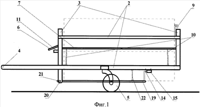 Транспортирующее устройство состоит из сварной несущей рамы, представляющей собой прямоугольную пространственную конструкцию, содержащую: три поперечные балки 1 (фиг.1, 2); четыре продольные балки 2, две из которых нижние; четыре вертикальные стойки 3; кронштейнов крепления 4 к пресс-подборщику; и самоустанавливающихся колес 5. К двум вертикальным стойкам 3, расположенным в передней части несущей рамы, жестко крепится приемный лоток 6, служащий для приема и подачи тюка на направляющие 7. Направляющие 7 шарнирно крепятся ко всем четырем вертикальным стойкам 3 и снабжены возвратными пружинами 10, которыми направляющие 7 возвращаются в рабочее положение и удерживаются запорным устройством 8 с электротяговым реле 11. Контактный датчик 9 шарнирно закреплен на задней поперечной балке 1 и имеет три положения: первоначальное (нейтральное), когда электрические цепи разомкнуты, среднее, при котором замыкается цепь запорного устройства 8 направляющих 7 и загорается сигнальная лампочка (не показана) на приборном щитке трактора, и крайнее, при котором замыкается цепь запорных устройств 14 выгрузного лотка 19. Запорное устройство 8 с электротяговым реле 11 (фиг.4) расположено на передней поперечной балке 1 несущей рамы и представляет собой двухрычажное устройство, где оба рычага 12 жестко соединены между собой перемычкой 13. Каждый из рычагов 12 одним концом шарнирно соединен с верхней поперечной балкой 1 несущей рамы, а другой конец фиксирует направляющие 7. На каждой продольной нижней балке 2 расположены два запорных устройства 14, представляющие собой одно рычажную систему с электротяговым реле 15 (фиг.3), где рычаг 16 одним концом шарнирно соединен с нижней балкой 2, а другим концом, где у него находится язычок 18, который фиксирует выгрузной лоток 19, шарнирно соединен со штоком 17 тягового реле 15. При этом электротяговое реле 15 связано электрической цепью с кнопкой принудительной выгрузки (не показана) на приборном щитке трактора для освобождения выгрузного лотка 19. Выгрузной лоток, имеющий длину три четвертых длины тюка, шарнирами 20 (фиг.1) соединен с передней вертикальной стойкой 3 и ограничен в повороте упором 21 для того, чтобы выгрузной лоток 19 не касался поверхности поля при выгрузке тюка. В исходное положение выгрузной лоток возвращается при помощи возвратных пружин 22.