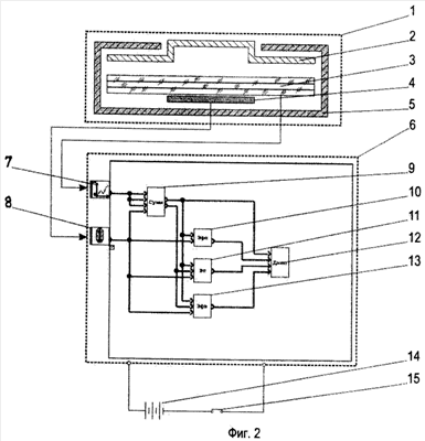 Напряжение на фотоэлементе 3 создает фотоЭДС, которая обусловливает соответствующее показание дисплея 12, затем сигнал подается на вход фотоЭДС7, а через него на блок вычисления суммарного солнечного излучения 9, в свою очередь блок 9 вычисляет и записывает в памяти величину солнечного суммарного излучения с заданным интервалом времени.