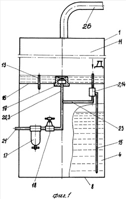 Верхняя секция 11 снабжена средством 2 для подвода жидкости и средством 3 для подвода воздуха. Средство 2 для подвода жидкости установлено на боковой стенке 12 верхней секции 11. Средство 2 для подвода жидкости выполнено в виде трубки 13 уровня жидкости, эжектора 14 и заборного рукава 15. Заборный рукав 15 размещен в полости нижней секции 4 (см. фиг.1, 2 и 5).