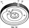 Зубчатое колесо 312 показано в перспективе на фиг. 3d. Передний конец крюка 325 входит в зацепление с зубьями 330 зубчатого колеса 312. Зубья 330 имеют асимметричную форму. Они выполнены так, что зуб, который находится рядом с передним, изогнутым концом крюка 325, наклонен к переднему концу крюка 325. Когда крюк 325 перемещается назад, то крюк прочно удерживает зуб и тянет его назад. За счет этого зубчатое колесо 312 немного поворачивается.
