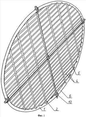 например волокон, и заполняют под давлением полимерным материалом. После термостатирования материала и разъединения формы получают готовую армированную полимерную секцию 2, 3 требуемых размеров и конфигурации. Для армирования продольных трубок 4 снаружи в полости литьевой формы могут быть уложены калиброванные трубки 11. Секции 2, 3 могут быть изготовлены также, например, путем использования литьевых форм (на чертеже не показаны), полости которых выполнены в виде рамы и поперечных связей с узлами в местах их сопряжения с продольными связями. В узлы вставляют изготавливаемые промышленностью калиброванные трубки 11 из полимерного материала, затем калиброванные трубки 11 и внутренние полости формы армируют и заполняют под давлением полимерным материалом. При этом калиброванные трубки 11 после термостатирования не снимают, что дополнительно увеличивает срок службы решетки и ее прочность. Также можно закладывать в узлы литьевой формы готовые продольные связи, выполненные в виде залитых полимерным материалом калиброванных трубок 11, армированных канатом 7 или любым волокнистым материалом. В качестве синтетического каучука может быть использован эластичный полиуретан необходимой плотности. Это увеличивает точность изготовления решетки, срок ее службы, обеспечивает прочность, упругость и дает эффект подпружинивания. Для увеличения прочности армирование секций 2, 3 может быть произведено не одним, а большим количеством армирующих материалов, например двумя и более.
