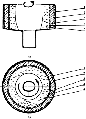 Пшеничную муку смешивают с водой при соотношении муки и воды 1:(1-2), выстаивают не менее 40 мин при температуре 32-35°С. Далее полученную водно-мучную смесь загружают в осадительную центрифугу и выдерживают в поле центробежных сил осадительной центрифуги с фактором разделения Fr не менее 380. После выдерживания водно-мучной смеси в поле центробежных сил, в центрифуге образуются две составляющие: первая составляющая – крахмал влажностью 30-60% и вторая составляющая – суспензия с пониженным содержанием крахмальной составляющей. Крахмал с содержанием посторонних включений не более 2% используется как самостоятельный продукт. Далее полученную суспензию с пониженным содержанием крахмальной составляющей смешивают с водой при температуре 20-35°С, загружают в осадительную центрифугу и выдерживают при втором центрифугировании в поле центробежных сил осадительной центрифуги с фактором разделения Fr не менее 200. В результате второго центрифугирования образуются две составляющие, одна из которых представляет собой тесто с клейковиной, остаточным крахмалом и прочими водонерастворимыми компонентами пшеничной муки, которое используется как самостоятельный продукт, а другая – жидкую фракцию, а именно заявленный в изобретении водный экстракт из пшеничной муки с повышенным содержанием альбуминов и водорастворимых пентозанов влажностью 90-95%. На чертеже представлена схема разделения суспензии внутри ротора 1 осадительной центрифуги после выдерживания в поле центробежных сил при втором центрифугировании. Согласно экспериментальным данным на внутренней стенке ротора 1 осаждается тонкий слой крахмала 2 влажностью 30-60%, далее поочередно следуют слой теста из водонерастворимых белков с трудноизвлекаемым крахмалом, жирами и прочими водонерастворимыми компонентами пшеничной муки 3, тонкий слой гелеобразного крахмала 4 влажностью 50-80% и водный экстракт 5 с растворенными в воде компонентами пшеничной муки влажностью 90-95%. После останова ротора 1 в режиме свободного выбега водная жидкая фракция 5 сходит на дно ротора 1 и на внутренней поверхности ротора 1 остаются тонкий слой крахмала 2, слой теста 3 и тонкий слой гелеобразного крахмала 4. После останова ротора 1 в режиме торможения водная жидкая фракция 5 размывает тонкий слой гелеобразного крахмала 4 с поверхности слоя теста 3. В этом случае на внутренней поверхности ротора 1 остаются тонкий слой крахмала 2 и слой теста 3.