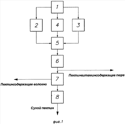 Полученную дисперсную массу после кавитационной обработки направляют на центрифугу 47 для разделения на жидкую пектинсодержащую фазу и твердую – пищевое пектинсодержащее волокно в поле действия центробежных сил при факторе разделения FR=6000-100000 до содержания в жидкой фазе низкомолекулярной взвеси не более 2,0-2,6%, затем жидкую фазу направляют на грубую фильтрацию на пресс-фильтре 50. Фильтрацию ведут при рабочем давлении 0,3 МПа до достижения в жидкой фазе взвеси не более 1,5-1,7%, затем отфильтрованную на пресс-фильтре 50- полученную жидкую фазу через накопительную емкость 51 направляют в микрофильтрационную установку 53. Последнюю ведут через керамические трубчатые мембранные фильтрующие элементы с рабочими размерами пор 0,5-0,3 мкм при давлении 0,3 МПа до содержания в жидкой фазе низкомолекулярной взвеси не более 0,8-1,0% при регулируемой температуре 45°С. Затем жидкую пектинсодержащую массу через накопительную емкость 54 направляют на очистку и концентрирование высокомолекулярной пектинсодержащей жидкой фазы на ультрафильтрацию в установку 56, затем диафильтрацию и нанофильтрацию соответственно на установки 57 и 60. Диафильтрацию и нанофильтрацию ведут с использованием керамических трубчатых или металлокерамических мембранных фильтрующих элементов с размерами пор 0,07-0,1 мкм и менее при рабочем давлении в аппаратах 0,4-0,5 МПа до достижения в высокомолекулярном пектинсодержащем концентрате низкомолекулярной взвеси не более 0,15-0,18% при регулируемой в теплообменном аппарате температуре 50-65°С, что обеспечивает концентрирование жидкой фазы до 14-18% пектиновых веществ. Накопленный в емкости 61 жидкий пектинсодержащий концентрат подвергают сушке в низкотемпературной сушильной установке 63 при температуре 13,7-50°С с конечной массовой долей влаги сухого порошка пектина 7,0-7,8% или в иных сушильных установках. Далее пектин расфасовывают.