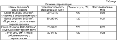 Банка объемом 1700 см3 – нагрев 30 минут, стерилизация 100 минут при температуре 120°С и противодавлении 0,23 МПа до достижения стерилизующего эффекта не менее шести условных минут, охлаждение 40 минут до температуры 35°С.