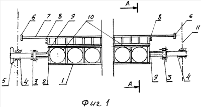 К верхней части камеры по ее длине шарнирно присоединена решетка, состоящая из штока 7, вилок 8 и роликов 6. На концах штока установлены ролики 6.