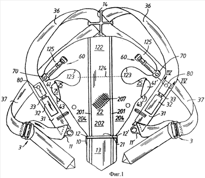 К части 122 пришита швом 62 фиксирующая фурнитура 61, приблизительно на половине длины по линии симметрии переднего элемента 22. Фурнитура 61 имеет два сквозных отверстия, которые отграничены одно от другого штифтом 64. Свободный концевой участок лямки 66 проходит через отверстие 63 вокруг штифта. Как можно видеть, свободный конец 67 указанной лямки содержит бегунковый захват 68, функция которого заключается в предотвращении протягивания данной лямки через отверстия фурнитуры 62. Фурнитура 62 взаимодействует с лямкой 66 по существу хорошо известным образом, допускающим регулировку эффективной длины лямки 66 между штифтом 64 и швом 65 путем натягивания конца 67 лямки или вытягивания фурнитуры 61 у шва 62 с обеспечением возможности выскальзывания лямки 66 из фурнитуры 61.