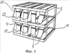 на фиг.5 показан другой вариант выполнения устройства согласно изобретению с собственной несущей конструкцией, которая предназначена для восьми главных упаковок, выставляемых на двух уровнях, и в которой отдельные толкающие рычаги установлены на соответствующих направляющих рельсах, при этом четыре выставленные главные упаковки пустые (отдельные штучные упаковки не показаны);