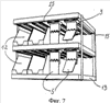 на фиг.7 показан еще один вариант выполнения устройства согласно изобретению, имеющего собственную несущую конструкцию с направляющими рельсами, установленными на стержнях, параллельных переднему и заднему краям несущей конструкции, так что положение отдельных толкающих рычагов и расстояния между двумя соседними толкающими рычагами можно независимо регулировать в соответствии с потребностями пользователя, при этом несущая конструкция тоже предназначена для размещения восьми главных упаковок на двух уровнях, отдельные толкающие рычаги установлены на соответствующих направляющих рельсах, а четыре выставленные главные упаковки изображены пустыми (отдельные штучные упаковки не показаны).