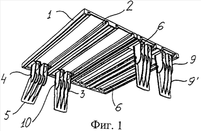 На фиг.1 показано устройство согласно настоящему изобретению, содержащее направляющую пластину 1, имеющую направляющие рельсы 2, соединенные с толкающими рычагами 3, каждый из которых состоит из двух элементов 4 и 5, соединенных друг с другом шарнирным соединением, и снабжен пружинами 6, каждая из которых прикреплена одним концом к направляющей пластине 1, а другим концом к верхнему элементу 4 толкающего рычага 3.