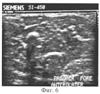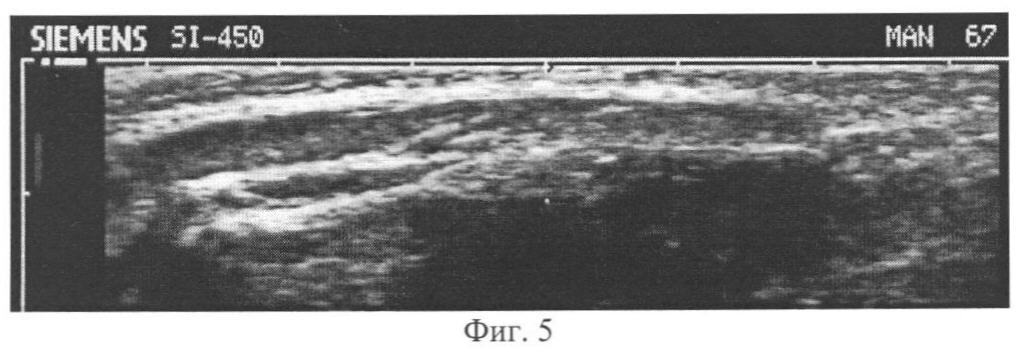 Фиг.5 – продольный УЗ-срез плечелучевой мышцы пораженного предплечья больного Л. до лечения.