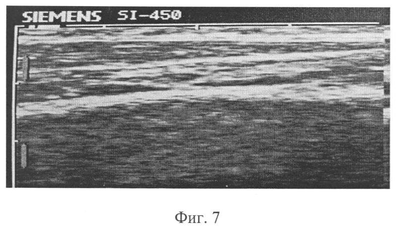 Фиг.7 – продольный УЗ-срез плечелучевой мышцы пораженного предплечья того же больного через 2 мес после оперативного удлинения.