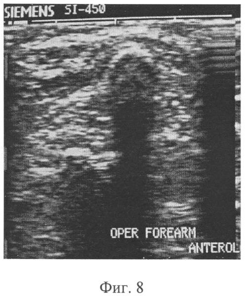 Фиг.8 – поперечный УЗ-срез плечелучевой мышцы пораженного предплечья того же больного через 2 мес после оперативного удлинения.
