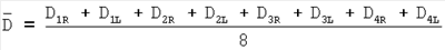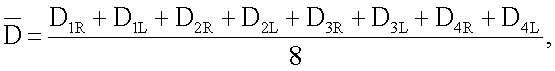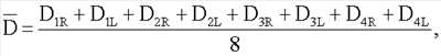 где D1R, D1L – ширина суставной щели в переднем отделе соответственно правого и левого височно-нижнечелюстных суставов, мм; D2R, D2L – ширина суставной щели в передне-верхнем отделе соответственно правого и левого височно-нижнечелюстных суставов, мм; D3R, D3L – ширина суставной щели в задне-верхнем отделе соответственно правого и левого височно-нижнечелюстных суставов, мм; D4R, D4L – ширина суставной щели в заднем отделе соответственно правого и левого височно-нижнечелюстных суставов, мм; DK – условная норма средней ширины суставной щели при различных нозологических формах зубочелюстных аномалий и деформаций челюстно-лицевой области, мм: DK=2,7 при дистальном, в т.ч. глубоком, прикусе; DK=2,3 при мезиальном прикусе; DK=2,9 при повышенной стираемости зубов.