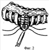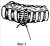 После этого все оставшиеся нити на дорсальной стороне завязывают. Со стороны надсечки накладывают амортизирующий узловой шов, фиксирующий деформацию соответствующего бифуркационного хряща (фиг.3). При этом в дорсальной половине края бифуркационного дефекта соприкасаются раневыми поверхностями, а в вентральном направлении – слизистой оболочкой.