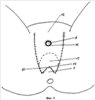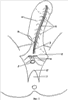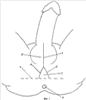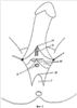 Разрез 1 кожи мошонки производят по срединной линии (raphe) над бульбарным отделом пещеристого тела 2 по направлению к заднему проходу 3 до окончания этого отдела. В дальнейшем разрез продолжают до lin.biischiadica 4 по двум линиям 5, 6, направленным к точкам, симметрично расположенным влево и вправо на 1-1,5 см от срединной линии промежности, с образованием V-образного лоскута 7 шириной 2-3 см, длиной 4-6 см (фиг.1).