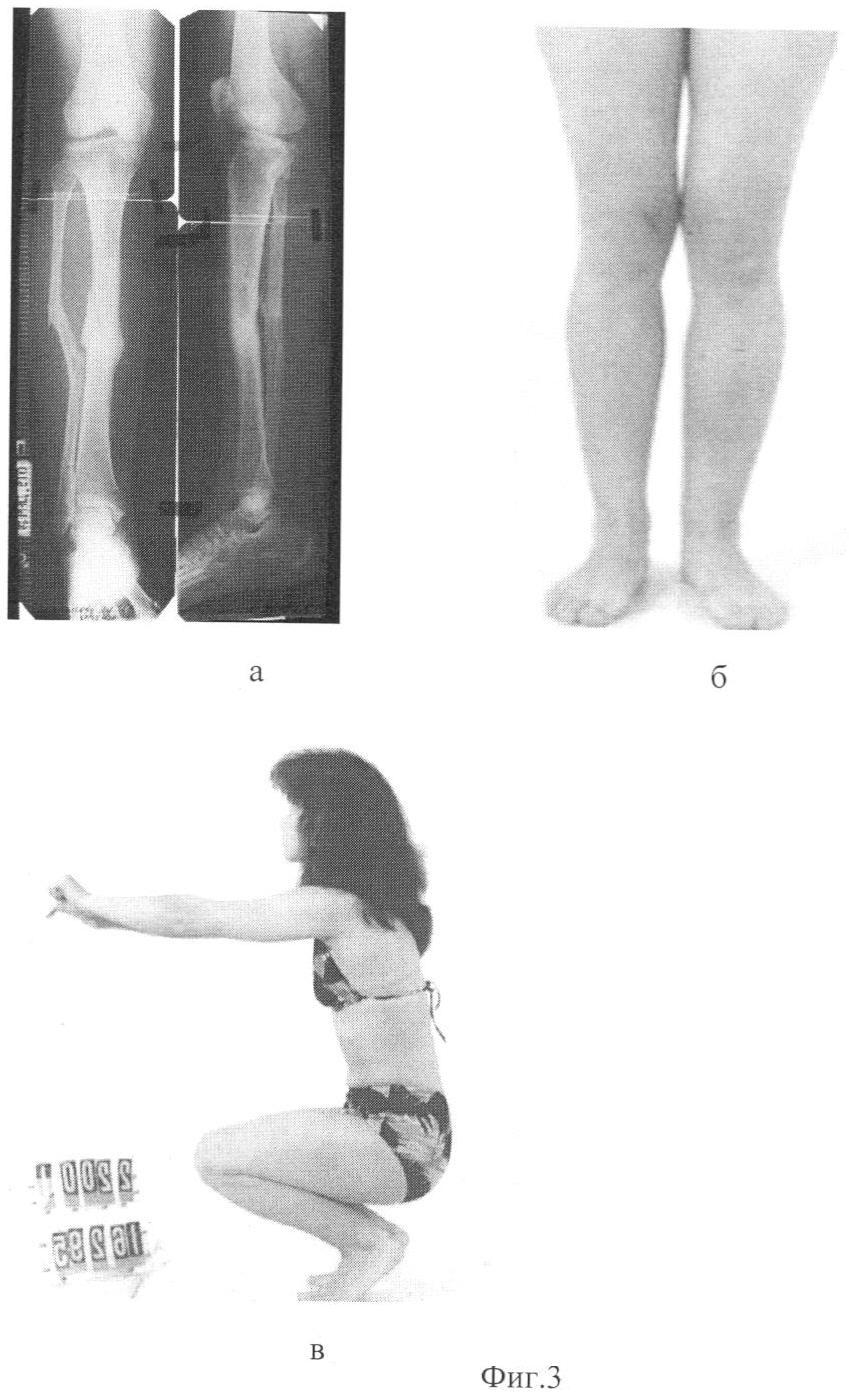 Через 3 месяца аппарат демонтировали, опороспособность конечности полностью восстановлена (Фиг.3а, б, в). Дополнительной иммобилизации конечности не требовалось.