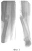Больная Е., 25 лет, история болезни 23270, поступила с диагнозом: открытый оскольчатый перелом обеих костей правой голени в средней трети с полным смещением отломков; дефект мягких тканей в средней трети голени (Фиг.1).