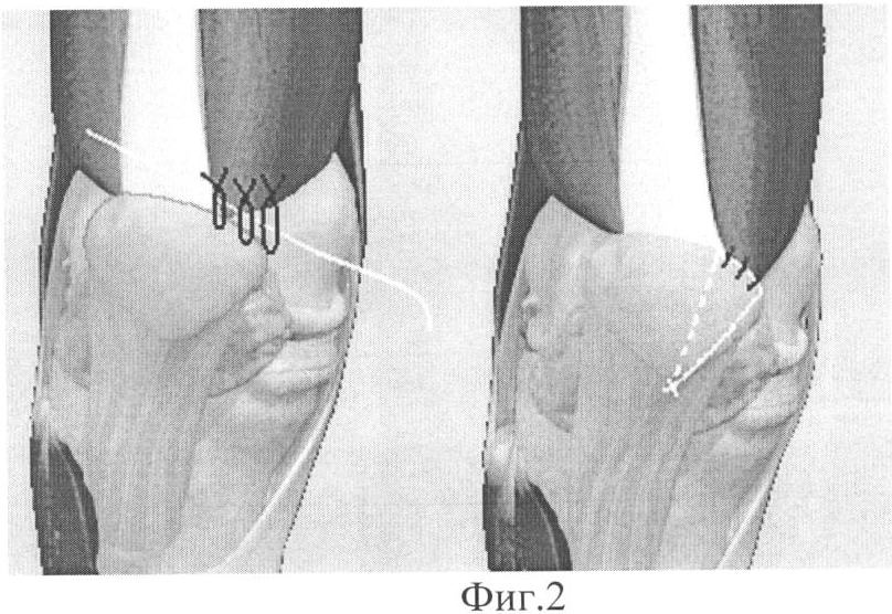 Предлагаемый способ иллюстрируется следующими чертежами: на фиг.1 изображено состояние m. vastus medialis obliquus до операции; на фиг.2 – проведение шовных нитей и их окончательное расположение перед натяжением под артроскопическим контролем; на фиг.3 – окончательный вид после затягивания нитей по достижении конгруэнтности пателлофеморального сочленения.