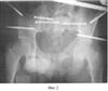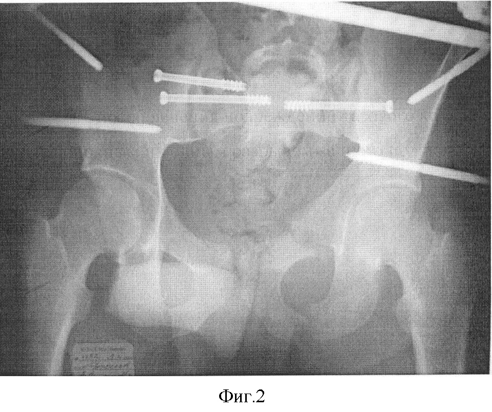 Больной находится в операционной, на рентгенпрозрачном столе, на неповрежденном боку, под спинальным или эндотрахеальным наркозом. После обработки операционного поля во многих случаях смещение сразу репонируется, если не происходит точного сближения лонных костей, и задняя верхняя ость подвздошной кости продолжает выступать, то давлением на гребешок смещенной подвздошной кости она толкается и ретируется книзу и кпереди по направлению к здоровой половине таза. Ассистент дополнительно проводит вытяжение и внутреннюю ротацию за нижнюю конечность. Далее, с помощью электронно-оптического преобразователя производят рентгенконтроль в прямой, каудальной проекциях. Если смещение устранено, то проводят по две спицы через подвздошную кость в тело крестца. Производят точечный прокол кожи, мягких тканей. По спице просверливают отверстия с помощью канюлированного сверла. Вкручивают по спицам два канюлированных винта с резьбой 32 мм, и задний комплекс жестко фиксируют. После больного переворачивают на спину с помощью ассистента, и проводят фиксацию переднего полукольца. Для этого в передневерхнюю ость крыла подвздошной кости и тело подвздошной кости (1,5-2 см выше вертлужной впадины в наиболее плотную, утолщенную часть таза) через проколы кожи, мягких тканей, с помощью троакара просверливают первый кортикальный слой и вкручивают метафизарные самонарезные резьбовые стержни, проходящие через два кортикальных слоя (фиг.2). Это позволяет уменьшить риск повреждения брюшной и тазовой полостей и более прочно стабилизировать стержни в костях. В крыльях стержни проходят в межкортикальной щели и также выходят на 1-2 мм через второй кортикальный слой. Стержни, расположенные во взаимно перпендикулярных плоскостях, соединяют с помощью балок-пластин. Введение опор в виде самонарезных метафизарных резьбовых стержней создает наиболее прочную конструкцию. Стабильная фиксация уменьшает риск возникновения нагноения мягких тканей, позволяет увеличить срок фиксации таза. Отмеченные зоны, направления и методы ввода стержней являются безопасными в плане повреждения сосудисто-нервных пучков, тазобедренных суставов, тазовых костей, перфорации брюшной и тазовой полостей.