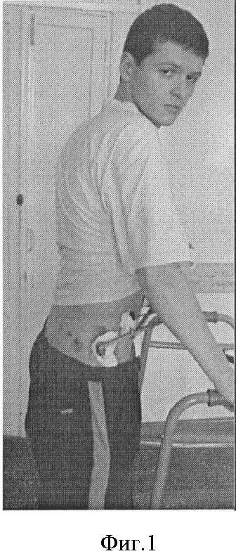 Далее больной находился на самостоятельном дыхании в палате интенсивной терапии, в положении полусидя на функциональной кровати. С первых суток проводилась дыхательная гимнастика, Л.Ф.К. профилактика пролежней. На третьи сутки, после удаления плеврального дренажа, больного стали поднимать после дуплекса сосудов нижних конечностей. На седьмые сутки больного постепенно стали обучать ходить с помощью ходунков (фиг.1). Швы сняты на двенадцатые сутки, раны зажили первичным натяжением. На пятой, шестой неделе больной стал передвигаться самостоятельно без костылей. Аппарат снят через 10 недель после операции. Сращение полное; работает по специальности.