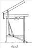 Устройство работает следующим образом: при нажатии на педаль 4 тяги 5, перемещаясь вверх, поворачивают крышку 2, открывая доступ к поддону 1 с инструментами. При этом пружины 6 уравновешивают большую часть веса крышки 2. Тяги 5, двигаясь вверх, действуют на шток 10 через поперечину 13, перемещая поршень 9. Поршень 9, перемещаясь, не испытывает сопротивления, т.к. воздух через клапан 14 перетекает под поршень 9.