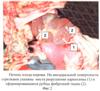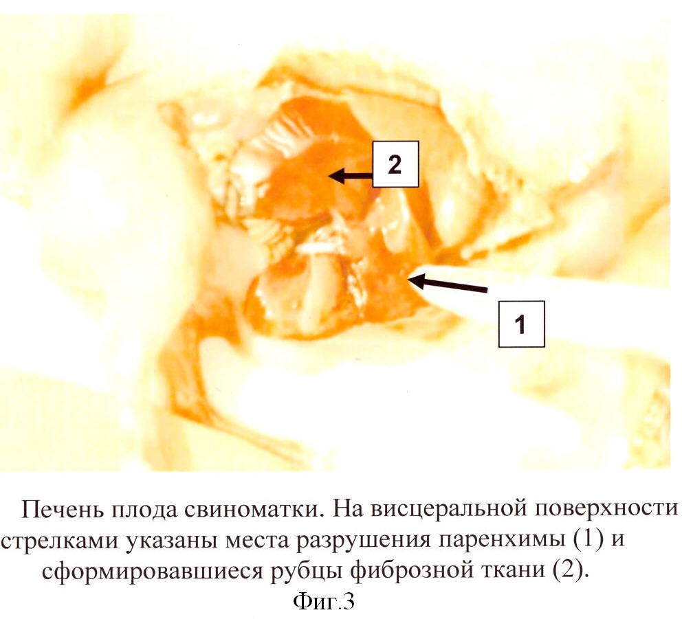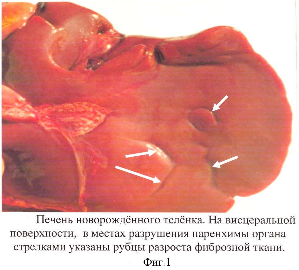 Для подтверждения специфичности признаков и понятия механизма развития патологии представлено три фотографии висцеральной поверхности печени: две в период неонатального и одна постнатального развития. На фотографиях стрелками показаны участки разрушения паренхимы органа с последующим разростом фиброзной ткани и формированием глубоких рубцов (см.фиг.1-3).