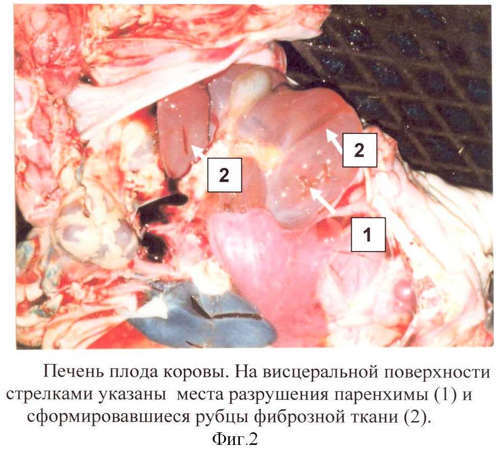 Способ патолого-морфологической диагностики токсической гепатодистрофии эмбрионального происхождения у крупного рогатого скота и свиней, включающий вскрытие трупов, извлечение органокомплекса, исследования печени, обнаружение признаков токсической гепатодистрофии в виде изменения объема, цвета и структуры органа, отличающийся тем, что у крупного рогатого скота и свиней на висцеральной поверхности печени выявляют рубцы разроста фиброзной ткани в местах разрушения ее паренхимы в период эмбрионального развития плодов.