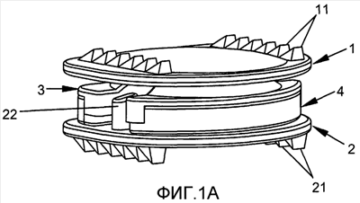 В варианте осуществления, показанном на фиг.1a-1d, 4b-4d и 5b-5e, верхняя поверхность верхней пластины (1) и нижняя поверхность нижней пластины (2) снабжены зубьями или насечками (11, 21), расположенными в области, по меньшей мере, двух кромок протеза. Данные насечки (11, 21), ориентированные так, чтобы предотвращать сдвиг протеза, служат в качестве закрепляющего средства для протеза до адгезии костной ткани к данным поверхностям пластин, находящихся в контакте с позвонками. Фактически, костная ткань, через несколько недель после хирургического вмешательства для имплантации протеза, распространится на поверхности, с которой данная ткань находится в контакте. На упомянутых поверхностях обеспечено пористое биосовместимое покрытие, чтобы обеспечивать возможность адгезии костной ткани и ее окончательного срастания с протезом.