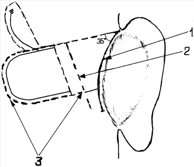 На чертеже использованы следующие позиции: 1 – заушный разрез кожи; 2 – разрез надкостницы; 3 – ложе под имплант (субпериостальный карман).