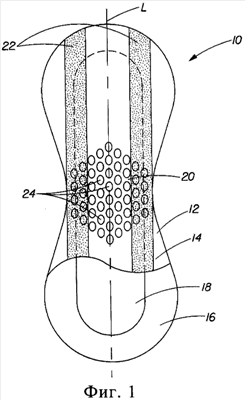 На Фиг.1 изображено гигиеническое средство 10, которое может быть гигиенической прокладкой, имеющей соприкасающуюся с телом поверхность 12 и верхний слой 14, по крайней мере часть которого имеет множество маленьких отверстий 24. Гигиеническая прокладка 10 имеет не пропускающий влагу нижний слой 16, соединенный с верхним слоем 14, и расположенный между ними абсорбирующий внутренний слой 18. Гигиеническая прокладка 10 имеет продольную ось L и также может иметь дополнительные конструктивные особенности, обычно свойственные гигиеническим прокладкам, включая “крылышки” (на Фиг. не показаны), как это известно в области техники, и/или накапливающий жидкость слой, расположенный между верхним слоем и абсорбирующим внутренним слоем, чтобы ускорить прохождение жидкости от верхнего слоя к абсорбирующему внутреннему слою 18. Верхний слой 14 гигиенической прокладки 10 имеет композицию лосьона 22, которую содержит, по крайней мере, его соприкасающаяся с телом поверхность 12.