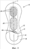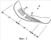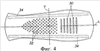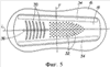 Как показано на Фиг.4, абсорбирующий внутренний слой 18 может быть асимметричным по отношению к поперечной оси Т и может иметь формообразующие элементы, такие как боковые ребра жесткости 34. Боковые ребра жесткости 34 могут усилить прочность продольных краев абсорбирующего внутреннего слоя 18. В качестве боковых ребер жесткости 34 может быть использована лента или полоска, шириной от 10 до 25 мм, которая, как правило, проходит вдоль внутреннего слоя 18. Боковые ребра жесткости 34 расположены вдоль краев внутреннего слоя 18, в той области, ширина которой практически не деформируется при использовании средства 10, и эти ребра жесткости могут передавать сдавливающее усилие ног на другие части средства для желательного образования чашечки или изгиба. Ребра жесткости 34 могут быть прикреплены с помощью клейкого материала, который нанесен на абсорбирующий внутренний слой или имеющиеся в нем дополнительные относительно жесткие материалы. Клейким материалом, используемым для боковых ребер жесткости 34, можно также приклеивать абсорбирующий внутренний слой 18 к нижнему слою 16.