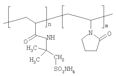 Особенно предпочтительными являются тауратные гомополимеры и сополимеры. Сополимеры являются особенно пригодными, когда элемент повторяющегося тауратного мономера является акрилоилдиметилтауратом (в виде или свободной кислоты, или соли). Мономеры, образующие сополимер с тауратом, могут включать: стирол, акриловую кислоту, метакриловую кислоту, винилхлорид, винилацетат, винилпирролидон, изопрен, виниловый спирт, винилметиловый простой эфир, хлорстирол, диалкиламиностирол, малеиновую кислоту, акриламид, метакриламид и их смеси. Когда появляется термин «кислота», этот термин означает не только свободную кислоту, но также С1-С30алкиловые эфиры, ангидриды и их соли. Предпочтительно, но необязательно, соли могут быть солями аммония, алканоламмония, щелочного металла и щелочноземельного металла. Наиболее предпочтительными являются соли аммония и алканоламмония. Наиболее предпочтительным в качестве сополимера для продукта, поставляемого Clariant Corporation под торговым названием Aristoflex® AVC, является акрилоилдиметилтаурат/винилпирролидоновый сополимер, который представлен INCI номенклатурой, имеющий следующую общую формулу: